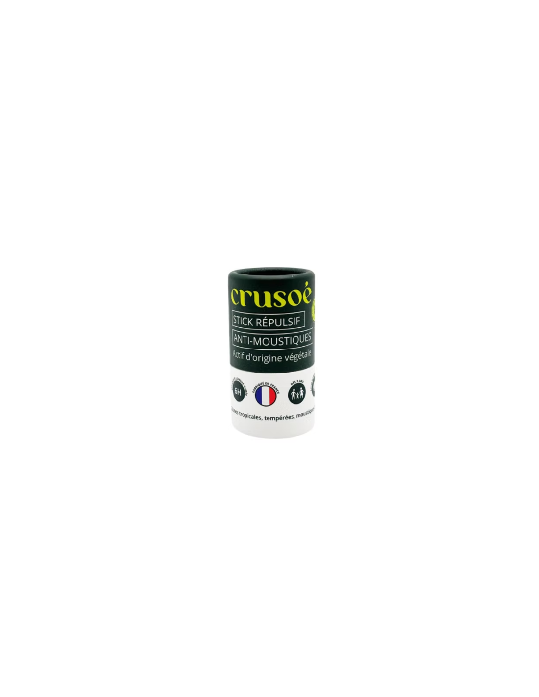 CrusoéStick Anti-Moustiques Crusoé 20g – Répulsif bio et naturel, à base d’huiles essentielles d’eucalyptus citronné et de géranium bourbon. Efficace jusqu’à 6 heures contre les moustiques, y compris le moustique tigre. Format solide pratique, sans alcool, non collant, adapté aux zones tropicales et tempérées. Fabriqué en France avec un emballage 100 % recyclable.